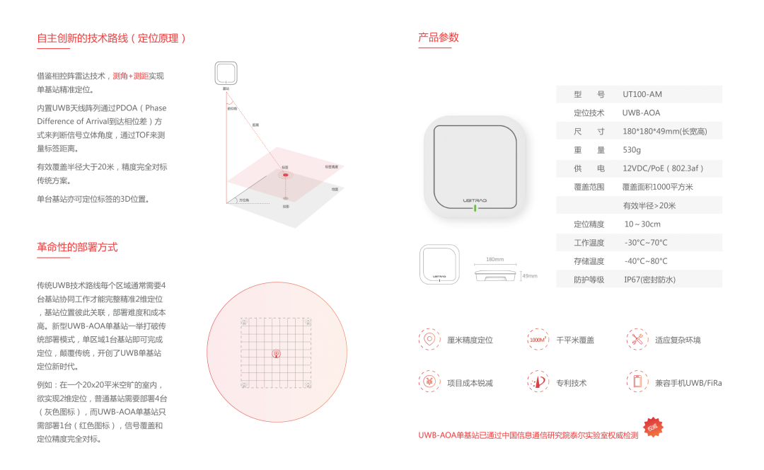 該方案在法院數字法庭、智慧監所的智慧監倉建設中降本尤為突出。以某法院為例,數字法庭建設中,采用傳統UWB高精度定位需要4臺基站,但最新的UWB-AOA方案只需要1臺基站,優于藍牙AOA,且不因層高限制覆蓋范圍,其有效覆蓋半徑20m完全滿足所有數字法庭的建設,并且在一維環境下,支持和傳統的UWB基站混用。使得整個方案在設計、部署上都實現了巨大的降本優勢。