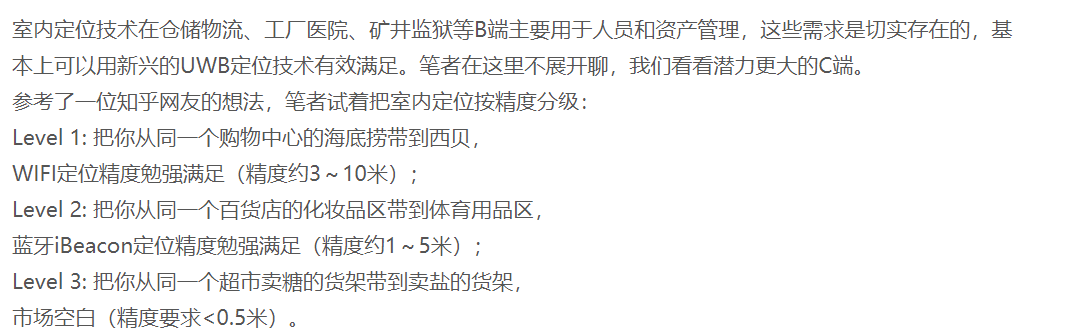 據有關統計,人的一生80%以上的時間在室內,移動通信服務80%發生在室內,80%的信息與時間和位置有關,想必室內定位也具有做大的潛力。正是看好這個方向,從2011年前后開始,國際、國內眾多室內定位創業公司如雨后春筍般出現,頂級互聯網公司也開始布局室內定位技術。