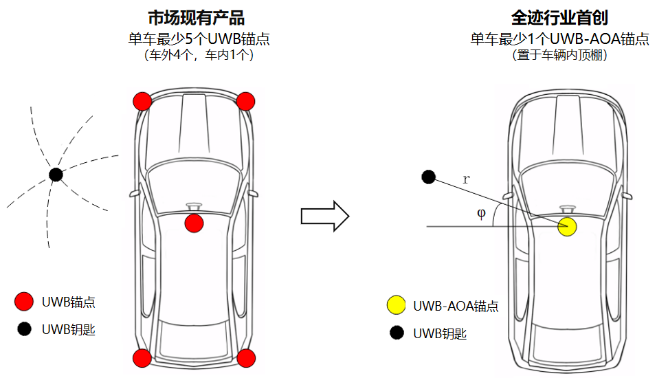 全跡科技基于天線陣列技術(shù)的UWB-AOA單錨點數(shù)字鑰匙系統(tǒng),讓每輛車最少僅需1個UWB-AOA錨點即可實現(xiàn)傳統(tǒng)5錨點的同等功能。