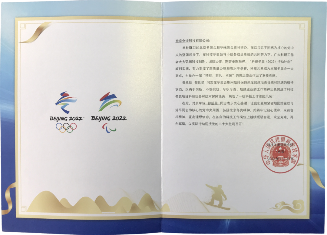 新華網(wǎng)播報:全跡科技獲科技冬奧領(lǐng)導小組感謝信